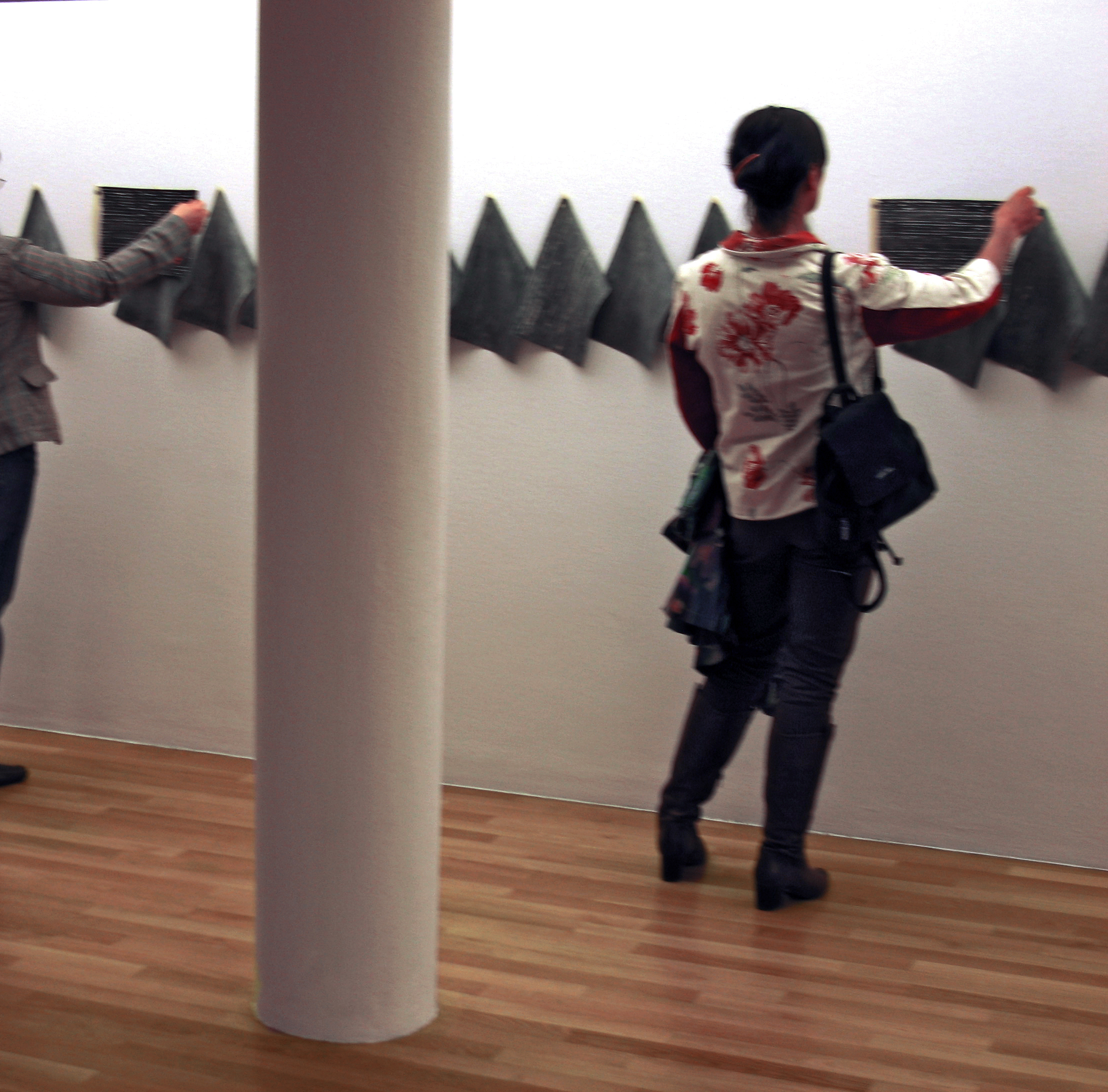 I did a small version of this piece originally for an exhibition in conjunction with the Wehrmachtsausstellung at Cooper Union in New York. Forty ledger-sized latex sheets, pinned to the wall with push pins along one edge, hang slack like flags or towels. Latex decomposes over time when exposed to light. Each latex sheet is covered with solid black rows of the imprints of typewriter ribbon. Occasionally a few lines bear legible typewritten text. Viewers are encouraged to lift the loose ends of the sheets and read the texts.