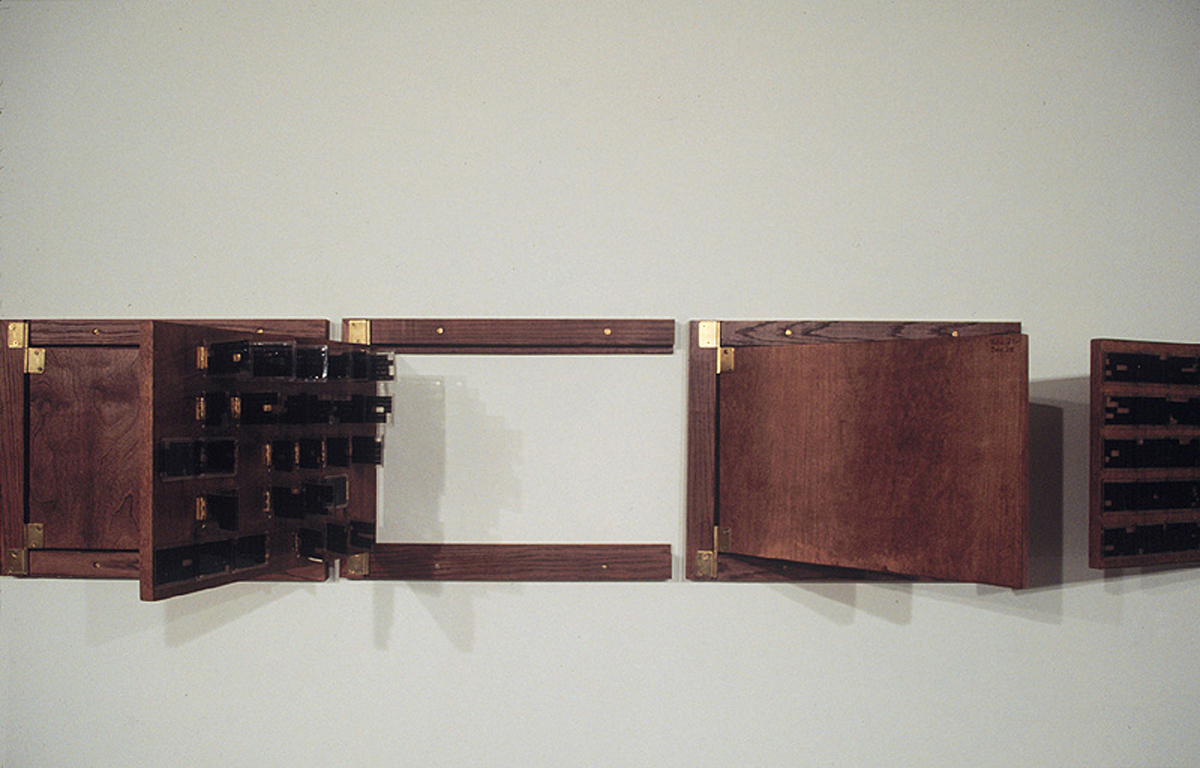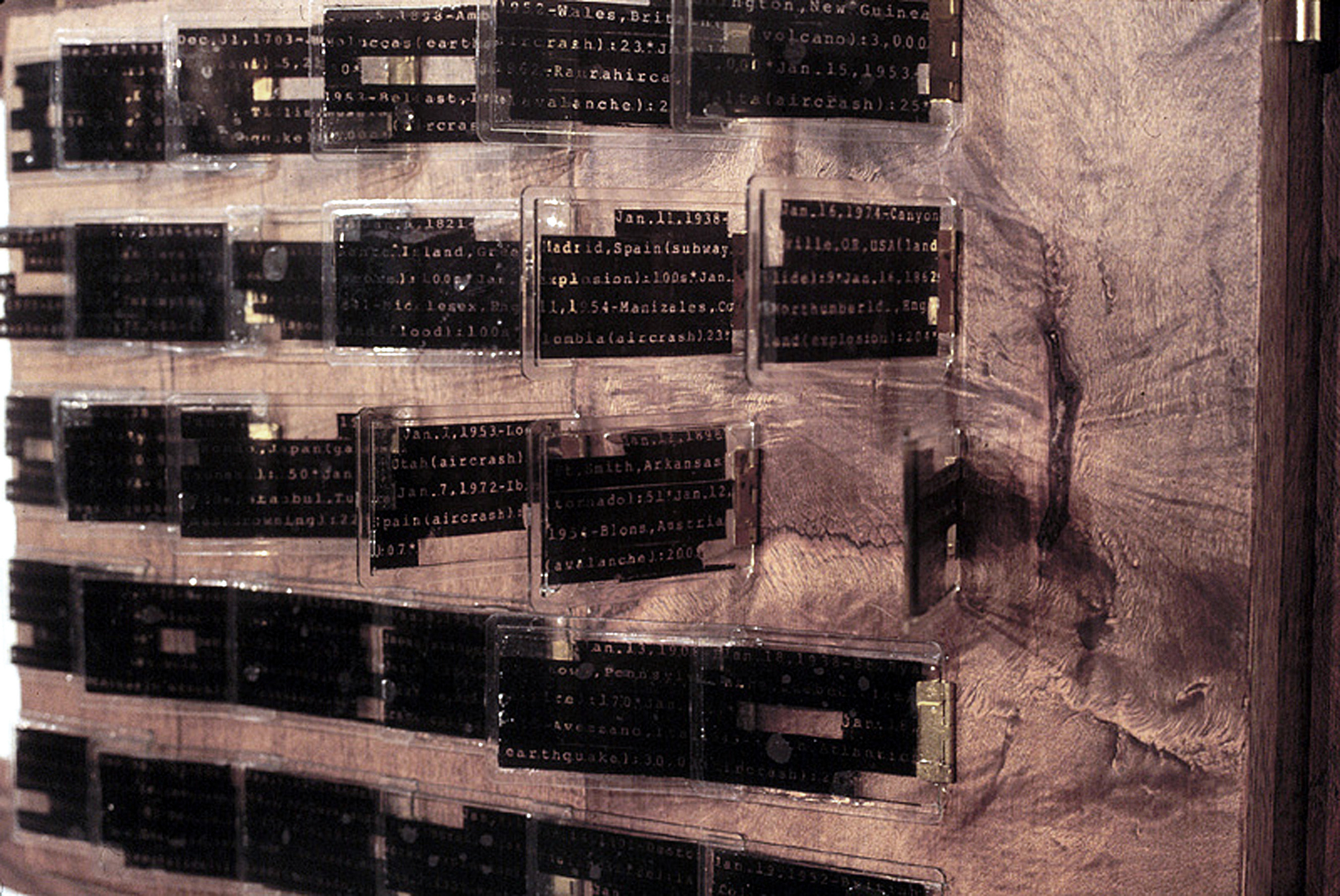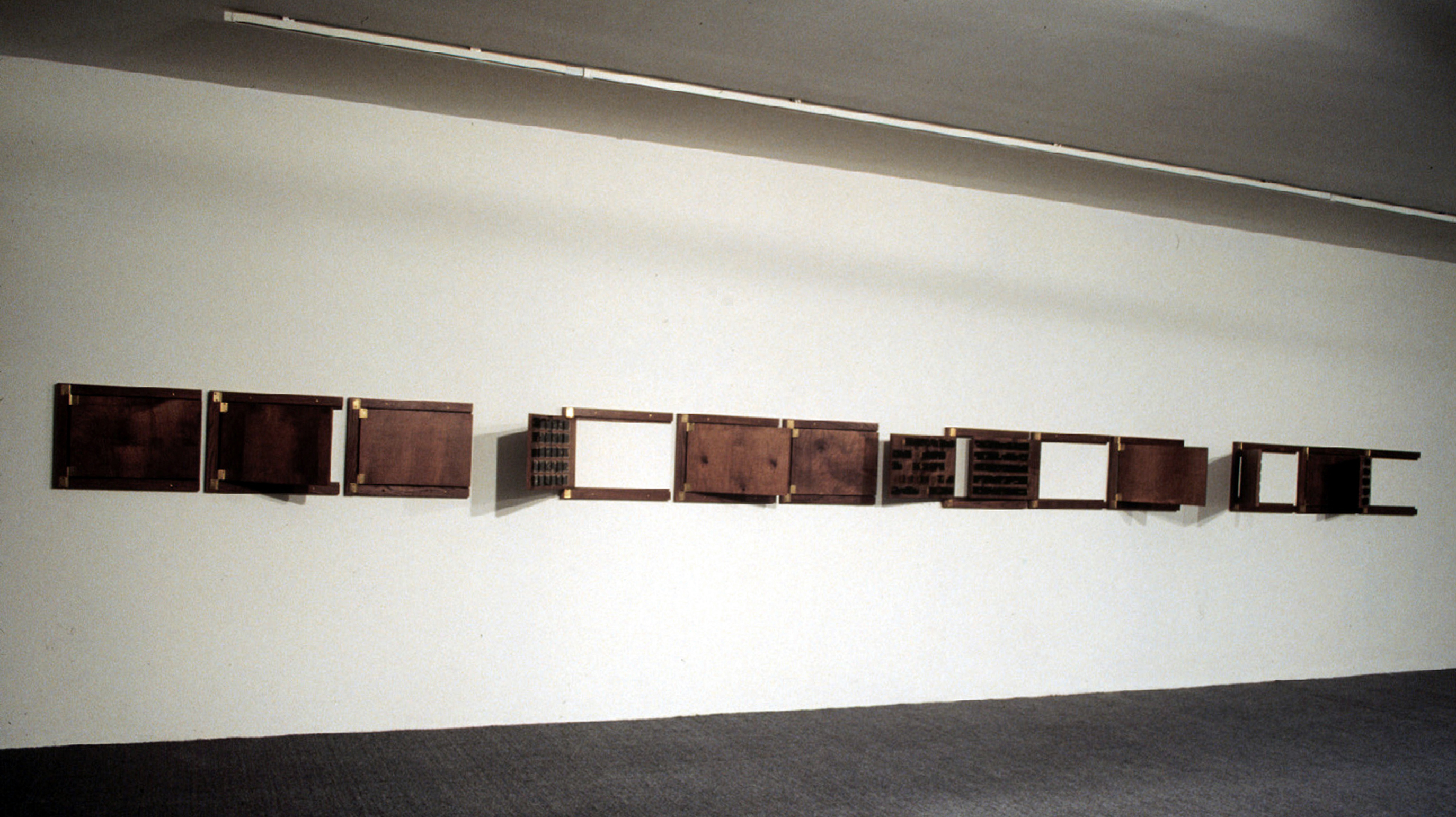 the ill-starred one Brass hinges, brass nails, typewriter film carbon, resin. 12 oak panels: 12 x 18” each. 366 acrylic plates: 3 x 2” each. (Installation view: Sala Mendoza, Caracas.) Collection of Museo de Bellas Artes, Caracas. Details